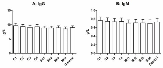 Immunoglobulin concentrations in cryoprecipitate. (A): IgG, n = 6, (B): IgM, n = 6. The cryoprecipitate was resolubilized in 10 mL (C1), 20 mL (C2), 30 mL (C3), and 40 mL (C4) plasma, Sn1, Sn2, Sn3, and Sn4 are the supernatants collected from above the cryoprecipitate, respectively, and fresh frozen plasma was used as a control.