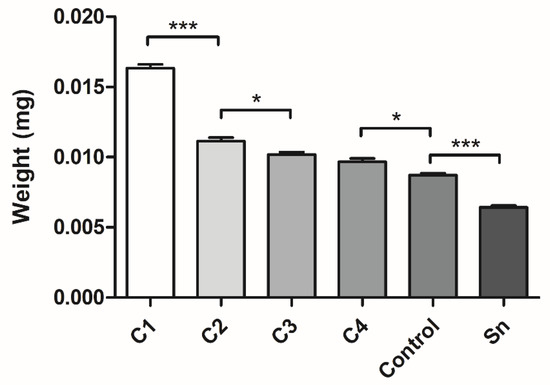 After the isolation of the membranes with different thicknesses, they were freeze-dried and their weights were measured using an analytical balance. The measurement supported our expectations, as the thicker membranes’ weights were greater, and significant differences were found between C1 and C2, C2 and C3, C4 and the control, and between the control and supernatants (Figure 4).