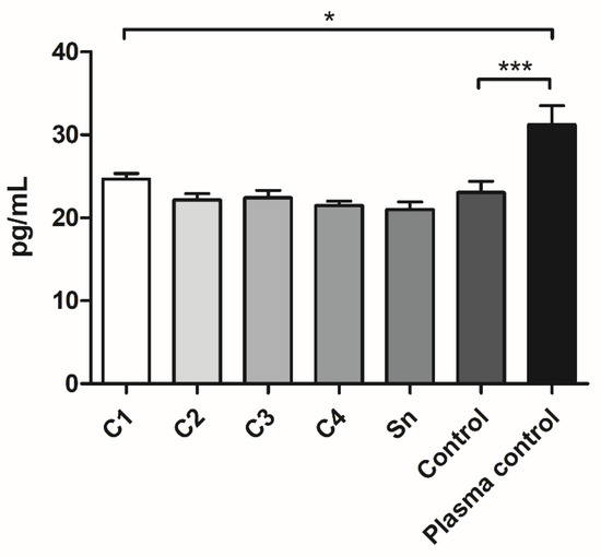 The PDGF-AB concentration of the FFP samples: different cryoprecipitate groups, supernatant (Sn), and fresh frozen plasma control (Control), where the cryoprecipitate was resolubilized in 10 mL (C1), 20 mL (C2), 30 mL (C3), and 40 mL (C4) plasma (n = 8: the FFP derived from four different donors, and the samples were measured in duplicate) and of the plasma samples, which were isolated manually (Plasma control, n = 10, the samples were taken from five donors and measured in duplicate). The significance level was p < 0.05, where * means that p is between 0.01 and 0.05, ** means that p is between 0.01 and 0.001, and *** means that p is lower than 0.001, and data are presented as mean ± standard error of the mean.