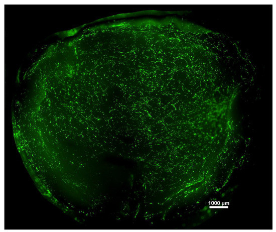 Live-dead staining was conducted to visualize the cells cultured on the membranes for seven days. A representative large-scale image was created to have an overview of the hBM-dMSCs growing on the scaffolds (Figure 6).
