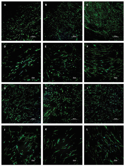 More detailed images were taken of the individual membranes with 4× and 10× magnification to see the attached cells. Living cells are stained with green, dead cells are yellow, and nuclei are blue. A few dead cells could be observed among living cells; however, their number was minimal. The distribution of the cells was not homogenous, as there were preferred regions with more cells, which can be seen in the images. However, based on the microscopic images, the thickness of the membrane does not have any effect on the viability and differentiation of the hBM-dMSCs; no tendency can be observed (Figure 7).