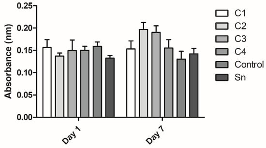 On the seventh day the proliferation of the cells was examined on the membranes. The differences were not significant, however, C2, C3, C4, and the control groups showed a growing tendency in cell attachment with the membrane thickness. The C1 and supernatant groups did not follow this trend. The difference in cell viability between the first and the seventh days was not significant either (Figure 8).