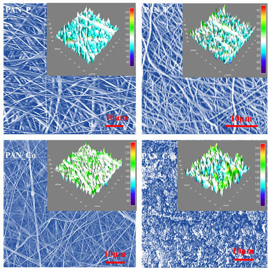 SEM micrographs of the PAN_P, PAN_F, PAN_Co and PAN_Coa NFs membranes. The 3D surface plots of the same are shown in the inset.