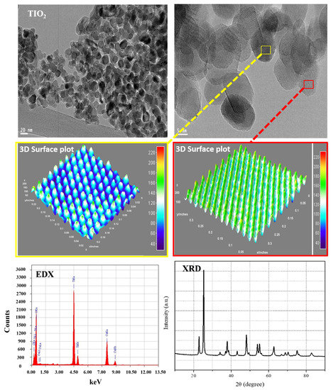 The TiO2 NPs synthesized by the homogeneous precipitation method at 600 °C were characterized by TEM, EDX and XRD (Figure 2). TEM images showed that the average particle size varied between 18 and 35 nm. Moreover, the particles were spherical and of good crystallinity. The HRTEM images showed well-resolved lattice features and distinct lattice fringes with no structural deviations from the anatase phase. The spacing of ~0.35 nm between adjacent lattice fringes of the anatase plane (101), confirms the XRD results discussed below [3]. The 3D surface plots of TiO2 NPs were prepared from the HRTEM images and highlighted with green-blue color lines. Examination of the 3D surface plots revealed that calcination had no effect on the long range atomic organization. Therefore, the surfaces appeared atomically flat. EDX spectroscopy for elemental analysis performed using EDX coupled with TEM, confirmed "Ti" as the major element. The XRD diffraction pattern confirmed the anatase phase of the TiO2 NPs. The diffraction pattern of anatase phase was found in crystal planes (101), (004), (200), (105), (211), (204), (116), (220), (215) and (303) crystal planes (JCPDS-21-1272). The anatase phase of TiO2 NPs reported in the literature has been shown to be photoactive and useful for wastewater treatment and purification [35,36].