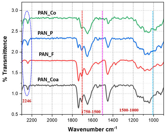 ATR-IR spectra of the PAN_P, PAN-F, PAN-Co and PAN_Coa NFs membranes.