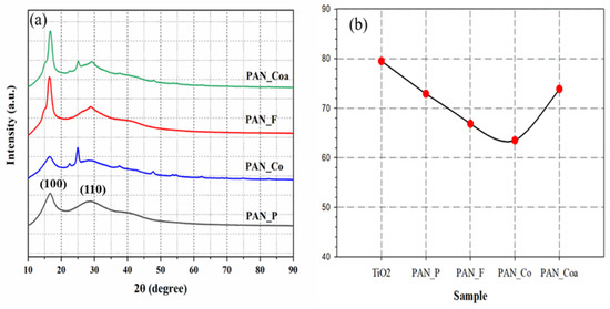 XRD was used to study the diffraction patterns and crystallinity of PAN_P, PAN_F, PAN_Coa and PAN_ Co NFs membranes (Figure 4a). The XRD diffraction patterns of PAN_P, PAN_F, PAN_Co and PAN_Coa NFs membranes showed a broad amorphous halo at 2θ ≈ 30° and a crystalline peak at 2θ ≈ 17°corresponding to the (110) and (100) crystalline planes [41,42] The diffraction patterns of PAN_Co and PAN_Coa NFs membranes also showed the diffraction pattern for the anatase phase of TiO2. The diffraction pattern of TiO2 NPs in the anatase phase is explained in Section 3.2. The appearance of the diffraction pattern of TiO2 NPs in the anatase phase in the diffraction patterns of PAN_Co and PAN_Coa NFs membranes confirms the presence of TiO2 in these. The % crystallinity of TiO2 NPs, PAN_P, PAN_F, PAN_Co and PAN-Coa NFs membrane was calculated using Origin 18 software and Equation (4) (Figure 4b). The % crystallinity showed a variation in the crystallinity of these samples. The crystallinity of TiO2 was 79.50%. A similar crystallinity for the anatase phase of TiO2 NPs is also reported in the literature [39,40,41,42,43].