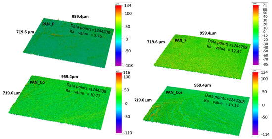 The surface profilometry results for PAN_P, PAN_F, PAN_Co and PAN_Coa NFs membranes are shown in Figure 5. The roughness of the membrane surfaces varied as a function of treatment and composition. PAN_P NFs membrane had the lowest surface roughness, while PAN_Coa NFs membrane had the highest, followed by PAN_F and PAN-Co NFs membranes. The highest surface roughness of PAN_Coa NFs membranes is attributed to the synergy of chemical treatment and random deposition of TiO2 NPs on the membrane surface. Similar results indicating increased surface roughness of the membrane due to the chemical modification of the membrane and the random deposition of TiO2 NPs on the membrane surface have been reported in the literature [46,47]. The increased surface roughness of the PAN_F and PAN_Co NFs membranes compared to the PAN_P NFs membrane could be explained by the chemical modification of the membrane ((PAN_F) as mentioned earlier) and the random dispersion of TiO2 NPs in the polymer matrix(PAN_Co) [32].