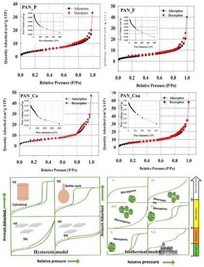 Adsorption-desorption isotherms of the PAN_P, PAN_F, PAN_Co and PAN_Cao NFs membranes under nitrogen atmosphere. IUPAC classified hysteresis and isotherm models.