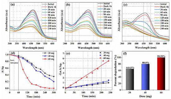 Dose study of photocatalytic PAN_Coa NFs membrane. Spectrophotometer spectra at different time intervals and photocatalytic doses (a) 20 mg, (b) 40 mg and (c) 60 mg, (d,f) degradation and (e) kinetics The concentration of methyl orange was constant (10 ppm).