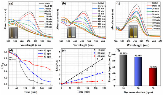 Concentration study of methyl orange. Spectrophotometer spectra at different time intervals and methyl orange concentrations (a) 10 ppm, (b) 20 ppm and (c) 30 ppm. The dose of the PAN_Coa NFs membrane was kept constant (60 mg), (d,f) degradation and (e) kinetics.