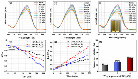 Photocatalytic activity of PAN_Co NFs membrane with different wt% of TiO2 NPs. Spectrophotometer spectra at different time intervals and wt% of TiO2 (a) 1 wt%, (b) 2 wt% and (c) 4 wt%. (d,f) degradation and (e) kinetics. The dose of photocatalytic membrane (60 mg) and concentration of the dye (20 ppm) were kept constant.