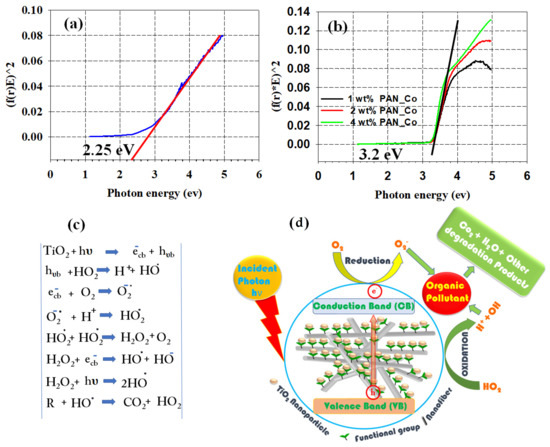 T-plots of the energy band gap (a) PAN_Coa, (b) PAN_Co, (c) reactions during photodegradation of the pollutant and (d) schematic of the photocatalysis process. The wt% shows the content of TiO2 NPs in the PAN_Co NFs membrane.