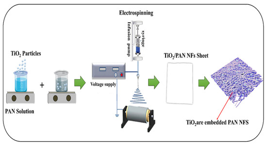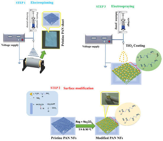 The suspension of 2 wt% TiO2 NPs was prepared by dispersing 0.2 mg TiO2 NPs in 10 mL DMF. The suspension was ultrasonicated (VCX500, Sonics and Material, Inc., Newtown, CT, USA) for 10 min. The suspension was added to a 20 mL plastic syringe. The syringe was placed in a controlled flow pump. The suspension was then electrosprayed onto the surface of the PAN_F NFs membrane at an applied voltage of 20 kV. The flow rate of the suspension was 0.8 mL/h. The distance between the collector and the needle tip was 150 mm. The schematic (Scheme 1, Step 3) shows the prepraration, synthesis and coating of the PAN_Coa NFs membrane.