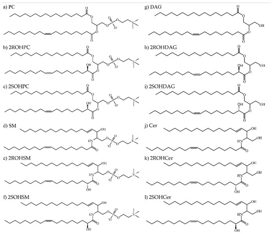 Chemical structures of the ligand set. (a) 1-palmitoyl-2-oleoyl-sn-glycero-3-phosphocholine (PC), (b) hydroxylated PC with 2ROHOA (2ROHPC), (c) hydroxylated PC with 2SOHOA (2SOHPC), (d) N-oleoyl-d-erythro-sphingosylphosphorylcholine (SM), (e) hydroxylated SM with 2ROHOA (2ROHSM), (f) hydroxylated SM with 2SOHOA (2SOHSM). (g) (S)-1-hydroxy-3-(palmitoyloxy)propan-2-yl oleate (DAG), (h) hydroxylated DAG with 2ROHOA (2ROHDAG), (i) hydroxylated DAG with 2SOHOA (2SOHDAG), (j) ceramide N-((2S,3R,E)-1,3-dihydroxyoctadec-4-en-2-yl)oleamide (Cer), (k) hydroxylated Cer with 2ROHOA (2ROHCer), (l) hydroxylated Cer with 2SOHOA (2SOHCer).