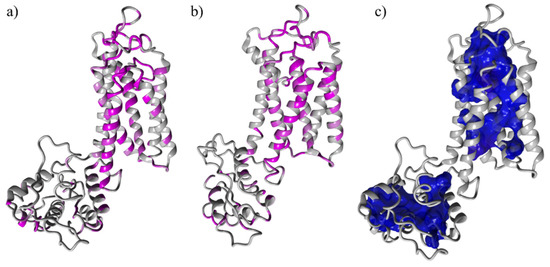 We hypothesized that the most conserved portions in the two proteins played a crucial role in the enzyme’s activity. We used Consurf [46] to estimate the evolutionary conservation of amino acid positions in a protein-based phylogenetic relationship between homologous sequences [60]. The magenta-colored regions in Figure 2a,b are the most conserved regions between the two proteins and indicate the highest probability for the binding site.