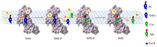 The SMS enzyme activities are schematized in Figure 5. PC is the natural substrate of SMS, and it can move freely in the membrane (1) to reach the enzyme’s catalytic site (2). The phospholipid head is transferred from the PC to a tyrosine (Tyr223 for SMS1 and Tyr167 for SMS2), leading to the formation of DAG and phosphorylated SMS enzyme (indicated as SMS-P) (3). Then, the DAG leaves the binding site heading into the membrane (4). The second substrate is also a component of cell membranes. Ceramide (Cer) moves from the membrane (5) to the catalytic site of the activated form of the enzyme (6). The phosphocholine head is transferred to ceramide to form SM (7). Restoration of the unphosphorylated form of SMS is completed with SM moving into the membrane (8).