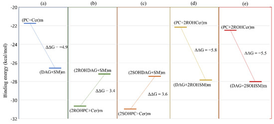 To study the energy pattern of this reaction, we analyzed three different systems. The first system represents the non-hydroxylated substrates (Figure 6a). In detail, the box in Figure 6a shows the sum of the binding energy of PC and Cer in the membrane (PC + Cer) m (ΔG = −21.7 kcal/mol) and the sum of the energy of binding of DAG and SM in membrane (DAG + SM)m (ΔG = −26.6 kcal/mol). The m as a subscript in parentheses indicates substrates immersed in a POPC membrane. The second system hypothesizes the incorporation of 2-hydroxy oleic acid (2OHOA) into the PC substrate, at C2 in the R configuration (2ROHPC) and in the S configuration (2SOHPC) (Figure 6b,c). The presence of hydroxyl group at C2 of PC leads to hydroxylated DAG (2ROHDAG and 2SOHDAG, respectively) and non-hydroxylated SM. In the third system, we started with hydroxylated ceramides (Figure 6d,e). Hydroxylated ceramides produce two hydroxylated SM (in R and S configuration). The values of ΔΔG are calculated as the difference between the binding energy of the DAG, SM pair, and the PC, Cer pair immersed in a POPC membrane.