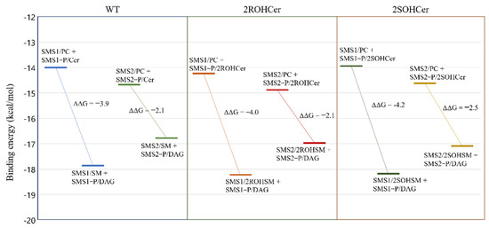 The differences between the two SMS isoforms can be similarly investigated by calculating the binding energies in steps 2, 3, 6, and 7, as shown in Figure 5 for non-hydroxylated and hydroxylated lipids on C2. In detail, we compared the binding energies of PC and SM in complex with SMS (SMSx/PC and SMSx/SM, respectively) and the binding energy of the phosphorylated isoform (SMSx-P) in complex with Cer and DAG (SMSx—P/Cer and SMSx—P/DAG, respectively) (Figure 7).