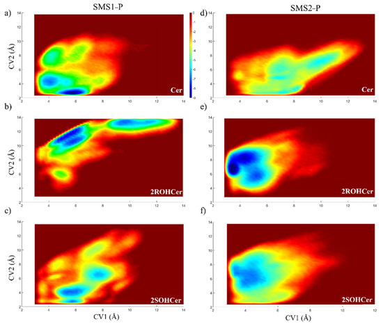 Two-dimensional free-energy surface of SMS1 in complex with (a) ceramide, (b) ceramide 2R hydroxylated, (c) ceramide 2S hydroxylated; SMS2 in complex with (d) ceramide, (e) ceramide 2R hydroxylated, (f) ceramide 2S hydroxylated. The CV1 and CV2 are the x- and y-axis, respectively.