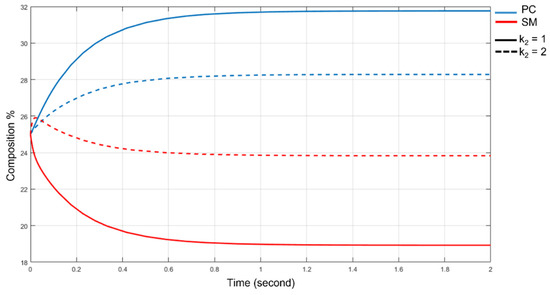 Standard output of SimBiology tool to represent the SMS reaction trend in normal condition (solid line) and for higher k2 (dashed line). On the x-axis, the time in seconds, on the y-axis, the species amounts expressed as % mol/mol. The colors of the lines have been assigned as follows: red for SM, and blue for PC.
