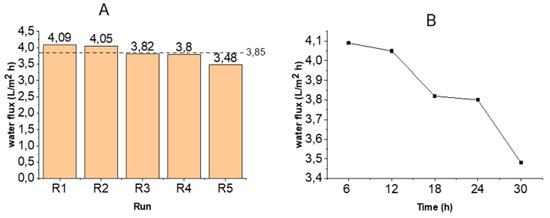 Figure 2A shows the water flux for each run. The highest water flux obtained was 4.09 L/m2·h—this was obtained after the first 6 h of operation. Compared with the pure water flux, there was a 47.3% decrease in water flux. This decrease may be due to the reduction in the net osmotic pressure of the DS, caused by the cumulative effects of the intrinsic salinity of the FS and reverse salt diffusion as well as water transport.
