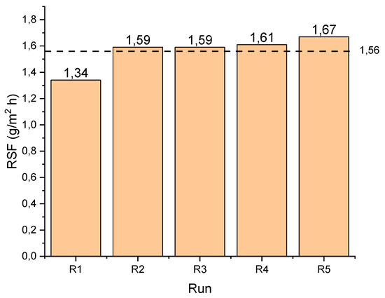 Figure 3 displays the values of the RSF (Cl− flux) for all runs, with an average RSF of 1.56 g/m2·h. The increase in RSF across the experimental duration may be due to increased deposits of Cl− within the membrane pores, which later migrated into the FS due to the convective effects of the permeate water. Particularly with Cl− being a univalent ion, this movement may be a lot easier to achieve.