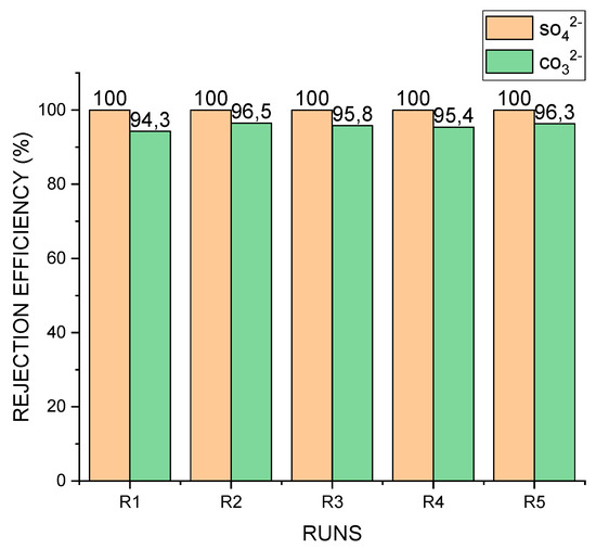 Rejection efficiency of SO42− and CO32−. Average rejection efficiency of CO32− = 95.6%.
