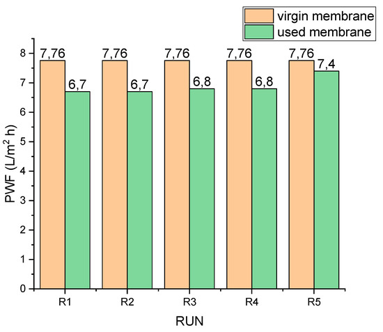 where WFR is the water flux recovery. This measures the amount of pure water flux obtained after membrane cleaning, showing the efficiency of the cleaning process. = PWF (L/m2 h) after cleaning, = PWF of virgin membrane [39]: