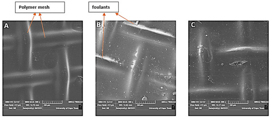 Figure 7 shows micrographs of scanning electron microscopy, performed for the CTA membrane before its use (virgin membrane; Figure 7A), after manual scrubbing (Figure 7B) and after chemically enhanced osmotic backwash (Figure 7C). Generally, osmotic backwash causes foulants within membrane pores to be dislodged into solution due to the reverse flow of the permeate. As permeate water is drawn in the opposite direction to the original flow, foulants that clog the membrane pores are forced off their positions and consequently swept into solution. As expected from Figure 7B, manual scrubbing was not sufficient in removing all foulants, since its effectiveness is limited to the immediate surface of the membrane.