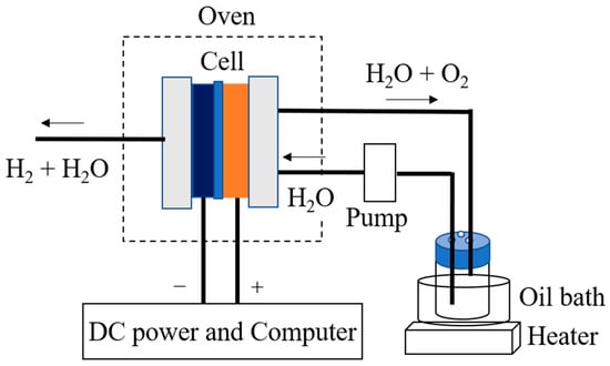 A CSPPSU membrane was sandwiched between an IrO2/Ti catalytic electrode for oxygen evolution and a Pt/C catalytic electrode for hydrogen generation, and the MEA was fabricated using a hot press method to evaluate the high-temperature water electrolysis characteristics. Figure 1 shows a schematic diagram of the water electrolysis evaluation system, which we developed.
