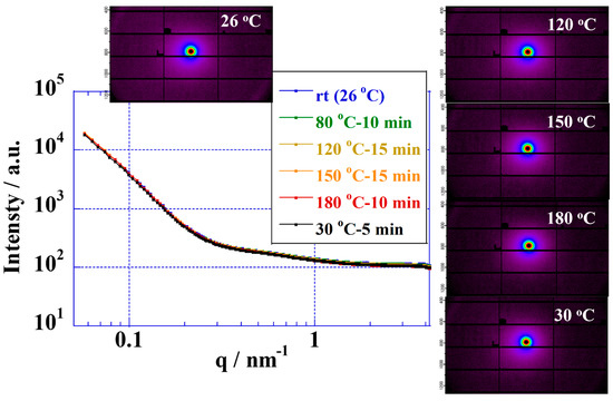 Fluorinated electrolyte membranes are useful in elevated-temperature water electrolysis due to their high proton conductivities and their ability to form good interfaces with catalytic electrodes. However, the glass transition temperatures of fluorinated electrolyte membranes (proton form) have been reported to be in the range of 90–120 °C, and applications above the glass transition temperature have durability issues [36,65]. From stability measurements involving Nafion and Aquivion membranes at elevated temperatures performed by using SAXS, the polymer structures are unstable above 100 °C [33]. On the other hand, hydrocarbon polymers with high glass transition temperatures, such as sulfonated poly(ether ether ketone) (SPEEK) [41,42], sulfonated polysulfone (SPSf) [44], sulfonated poly(phenyl sulfone) [45,62], sulfonated poly(arylene ether sulfone) [46,58], poly(benzimidazole) [50], etc., show great promise as electrolyte membranes for water electrolysis above 100 °C [5,12,13]. The glass transition temperatures of CSPPSU membranes are about 200 °C [62], making them suitable as electrolyte membranes for water electrolysis above 100 °C. We first investigated the stabilities of CSPPSU membranes up to 180 °C using temperature-controlled SAXS (Figure 2). The polymer structures of the CSPPSU membranes did not change from room temperature to 180 °C. In addition, the polymer structures after spontaneous cooling from 180 °C to room temperature were the same as those at room temperature before the heating was applied. These results suggest that the polymer structures of the CSPPSU membranes are thermally stable up to 180 °C.