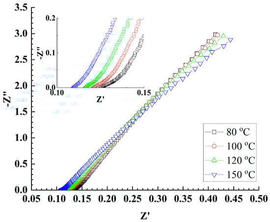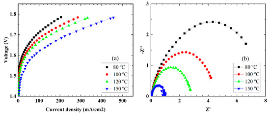 To determine the characteristics during elevated-temperature water electrolysis, the MEAs were set in single cells and evaluated at cell temperatures in the range of 80–150 °C while water was supplied at a rate of 2.0 mL/min to the anode side only. Figure 4 shows the current density–voltage (Figure 4a) and EIS (Figure 4b) characteristics as a function of cell temperature. The current densities increased with an increase in the cell temperature. A maximum current density of 456 mA/cm2 was obtained at a cell temperature of 150 °C and 1.8 V.