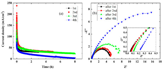 The stability of the MEA cell containing the CSPPSU membrane at elevated temperatures was investigated. Figure 6 shows the current density vs. time characteristics (Figure 6a) and EIS characteristics (Figure 6b) for four runs at 120 °C and 1.7 V. The large drop in current density immediately after the start of the measurement means that the cell overvoltage is large (Figure 6a). In addition, the current density decreased with each repetition of the measurement from the first to the fourth time. These results are consistent with the EIS results. The resistivity of the CSPPSU membrane and the impedance at the interface between the membrane and the catalytic electrode increased with each repetition. After the fourth measurement, the resistance of the CSPPSU membrane and the impedance at the interface between the CSPPSU membrane and the catalyst electrode were large. After evaluating the stability, the cell was disassembled, and it was found that the CSPPSU membrane and the catalytic electrode had separated. These results suggest that the increase in the impedance in the EIS characteristics is due to the separation between the membrane and the catalytic electrode. There have been reports on the use of ionomers [23], inkjet printers [28], and coating methods [29,30] to improve the interface between the electrolyte membrane and the catalytic electrode with the goal of high performance and improved durability during water electrolysis. In the future, the best method for assembling the CSPPSU membrane and the catalytic electrode to improve the current density and stability must be studied.