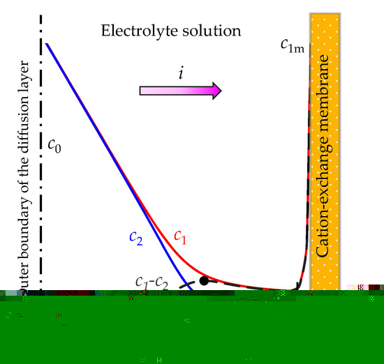 Membrane systems form the basis of electrodialysis, nano- and microfluidic devices, which are used in water purification, agricultural processing (milk, wine, etc.), chemical analysis and many other human activities [1,2,3,4]. These applications of membrane systems are determined by the selective properties of ion-exchange membranes, which allow ions of the one sign (counterions) to pass through and prevent the movement of ions of the opposite sign (coions) [5]. The difference in the behavior of ions of the opposite signs in the membrane leads to the formation of a space charge region (SCR) at its surface [6].