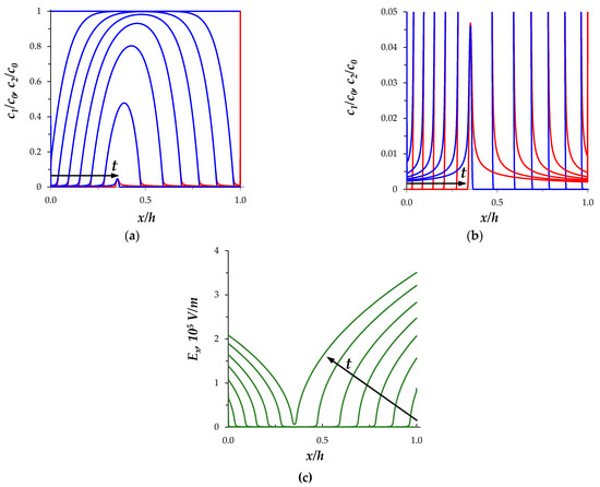 (a) Distributions of the normalized concentrations of cation, c1/c0, (red lines) and anion, c1/c0, (blue lines); (b) enlargement fragment of (a); (c) distribution of the electric field strength, Ex. Calculation results at t = 0, 4, …, 24, 25.65 s for perfectly selective membranes T2C = T1A = 0, current density i = 2ilim.