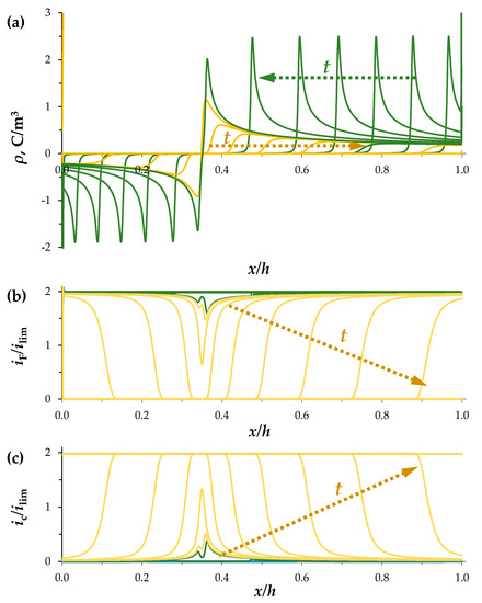 Over time, the SCRs extend and their local extrema shift into the depth of the solution (green lines in Figure 3). At s, when the electroneutral layer between the SCRs of opposite signs disappears, the space-charge breakdown occurs. The charge density, ρ, rapidly decreases and practically disappears in 0.1 s in the entire channel cross section (with the exception of quasi-equilibrium regions near the ion-exchange membranes), while the conduction current, , decreases to 0, and the charging current, , reaches the specified value of the current density, i (yellow lines in Figure 3).