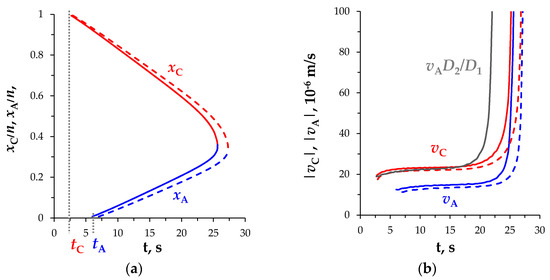 (a) Coordinates of the local extrema, xC and xA; (b) Absolute values of the local extrema velocities, vC and vA. The results for the space-charge extremum for the anion-exchange membrane (AEM) are marked in blue color, for the cation-exchange membrane (CEM)—in red color; tA and tC denote the moments of the appearance of the SCR extrema at the AEM and CEM, respectively; T2C = T1A = 0 (solid lines) and T2C = T1A = 0.03 (dashed lines), current density i = 2ilim. Value vA(t−tA)D2/D1 is shown in black in Figure (b).
