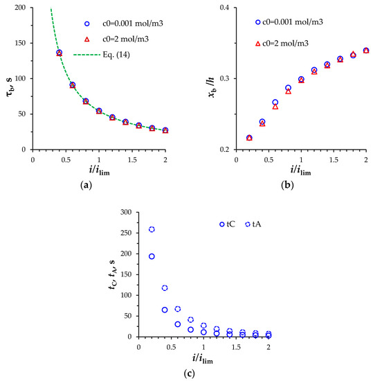 (a) The space-charge breakdown time, τb calculated by the model (markers) and by Equation (14) (dashed line); (b) distance from the AEM to the local minimum of the SCR before the discharge, ; (c) the time of the appearance of local extrema of the SCRs at the AEM, tA, and CEM, tC. Results for T2C = T1A = 0.03, c0 = 0.001 mol/m3 (round markers) and c0 = 2 mol/m3 (triangular markers).