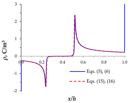 Distribution of the space charge density, 𝜌, at t = 24 s calculated with Equations (5) and (6) (solid line) or with Equations (15) and (16) (dashed line) for c0 = 0.001 mol/m3, T2C = T1A = 0.03, i = 2ilim.