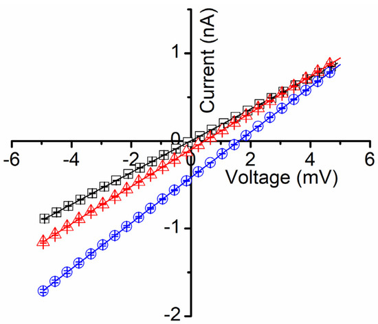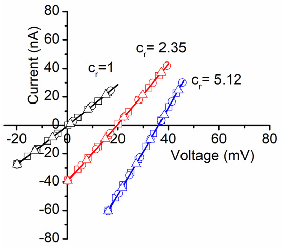 Insertion completion was indicated by stable ionic currents, achieved in approximately one hour after lysenin addition. The amplitude of the macroscopic ionic currents and the unitary conductance of single channels were used to estimate the number of inserted channels, which varied from several hundred to a few thousand for each membrane we used. After stabilization, we determined the membrane voltages originating from the chemical gradients produced by the addition of small and known amounts of concentrated ionic solutions to the grounded reservoir. The experimental data were recorded with pClamp 10.6.2.2 (Molecular Devices), plotted with Clampfit 10.6.2.2 (Molecular Devices), and the membrane voltages Vm determined as the x-intercept of the IV plots (the reversal potentials) recorded for each of the asymmetrical ionic conditions (including symmetrical ionic conditions controls) [7,15,17,18,30]. For each IV plot, we set a voltage range of 20 mV and lower and upper limits such that the plots crossed the x-axis. A single voltage sweep was set for 20 s, and the sampling rate was set to 10 samples/s (hence a 0.1 mV resolution). As detailed in Figure 1 as an example for NaCl, for each of the concentration ratio (cr) conditions (cr = 1, 2.35, and 5.12, respectively) we recorded three sweeps within the same experiment; the excellent overlapping of the sweeps for identical ionic conditions indicates attaining a steady state. The linear fit of the experimental data in Clampfit provided the y-intercepts and slopes, which were next used to determine the x-intercepts (membrane voltages).