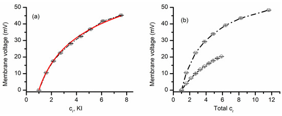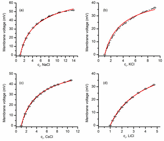The averaged values of the membrane voltage were determined by using a custom-made analysis program in R, which also calculated the concentration ratios for each of the experimental conditions by accounting for added ions. The averaged membrane voltages and concentration ratios were plotted and fitted (Origin 8.5.1, OriginLab Corporation, Northampton, MA, USA) with the Goldman–Hodgkin–Katz (GHK) equation [7,15,16,17,18,30], adjusted for one cation (C+) and one anion (A−) monovalent ion species: