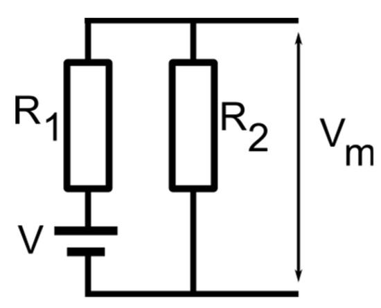 The electrical model for a membrane containing lysenin channels in both open and sub-conducting states. The model includes a voltage source V, open channels of total resistance R1, and sub-conducting channels of total resistance R2. The resulting membrane voltage Vm may be estimated from the electrical parameters of the equivalent circuit.