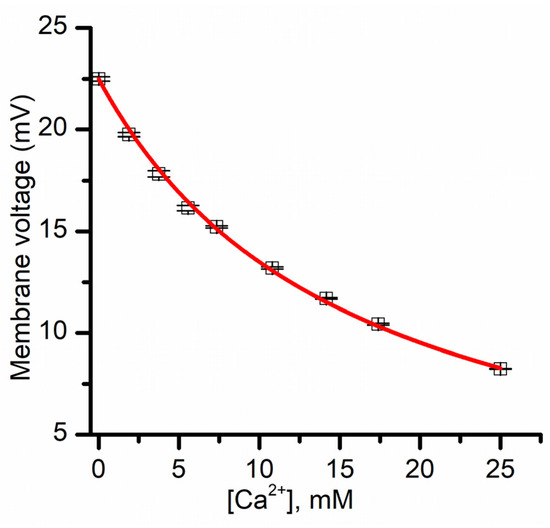 The last equation predicts that the membrane voltage established from chemical gradients must monotonically decrease with increasing Ca2+ concentration. To verify this hypothesis, we measured the variation of the membrane voltage created by KCl gradients upon successive Ca2+ addition. We utilized buffered KCl (50 mM) support electrolyte and created a membrane voltage of ~22.4 mV by adding KCl to the grounded reservoir (for a concentration ratio of 4.1). The addition of Ca2+ up to 25 mM to both reservoirs decreased the membrane voltage in a concentration-dependent manner, as predicted by Equation (5) (Figure 6). The plot was fit with Equation (5), in which we utilized an f value of 0.2, as previously determined from conductance measurements [12]. The fit provided a K value of 0.32 ± 0.07 mM (n = 2). This Langmuir constant is several times larger than what was determined from macroscopic conductance measurements (i.e., K = 0.05 mM [12]). However, those experiments were performed by utilizing 150 mM salt for the supporting electrolyte, and our experiments employed 50 mM. As the primary interaction between divalent metal cations and lysenin channels is presumably electrostatic [12], one may easily anticipate that a lower ionic strength of the solution environment augments the electrostatic interactions by reducing ionic screening; as our experimental determinations indicate, this clearly leads to an increased adsorption constant.