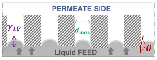The Liquid Entry Pressure can be calculated based on the Young–Laplace equation [12]. According to Equation (1) and Figure 1, the LEP depends on the surface tension of the liquid , the largest size and geometric factor B of the membrane pores and the contact angle of the liquid at the pore entrance ():