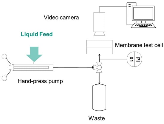 Figure 2 shows schematically the test rig. To conduct the feed liquid towards the membrane, and precisely set the pressure in the feed chamber, a manually operated SITEC manual screw press (SITEC-Sieber Engineering AG, Maur, Switzerland) was used. The pressure was increased 0.1 bar each step and held for 30 s. The pressure at which a water droplet was visible through a USB digital microscope on the back side of the membrane was recorded using a pressure sensor (Model P-31, accuracy of 0.005 bar, WIKA Alexander Wiegand SE & Co. KG, Klingenberg, Germany). A three-way valve (DWV-1) ensured the elimination of possible air bubbles in the system. The remaining air pockets could be detected through a transparent inlet channel.