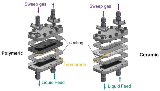 To be able to carry out measurements of liquid entry pressure at higher temperatures and pressures, a multi-purpose aluminum membrane-test-cell was used, see Figure 3. The test cell allows the testing of different membrane thicknesses and materials as well as the realization of not only LEP measurements but also permeation tests. This membrane test cell is not optically accessible, therefore, the Pressure Step Method was used to detect the LEP [41]. The aluminium membrane-test-cell consists of a base plate with 24 channels of 0.5 × 0.5 mm cross-section as a feed side. The cover plate for the sweep gas side presents 12 channels of 1.5 × 1 mm cross-section. Flat gaskets made of silicon or Viton on each side ensure tightness. Flat sheet membranes with sizes of 31 mm × 87 mm were tested. To test the polymeric membranes, a metallic grid support was used to ensure mechanical stability. For the ceramic membranes, a membrane holder made of PTFE was used. Membrane holders of different thicknesses were used, depending on whether a sintered stainless steel support was used for higher pressure experiments.