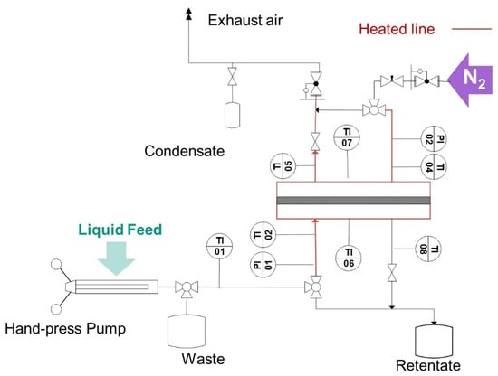 Electrical heating on the inlet and outlet lines of the test cell, as well as in the test itself (in Figure 4 marked in red) was used to heat the fluid and keep the temperature of the fluid in the cell. Near isothermal experiments were ensured, giving enough time for heating up the fluids and the test cell to reach thermal equilibrium before performing the tests. The temperature was monitored using several thermocouples placed at the inlets and outlets of the gas (TI 04 and TI 05) and water side (TI 02 and TI 08), as well as in the upper and lower side of the test cell shell (TI 06 and TI 07). The pressure in the feed side was built up statically by closing the feed outlet valve and delivering fluid with a SITEC manual screw press (SITEC-Sieber Engineering AG, Maur, Switzerland. To build up the pressure on the permeate side; pressurized nitrogen in counter-current was used.