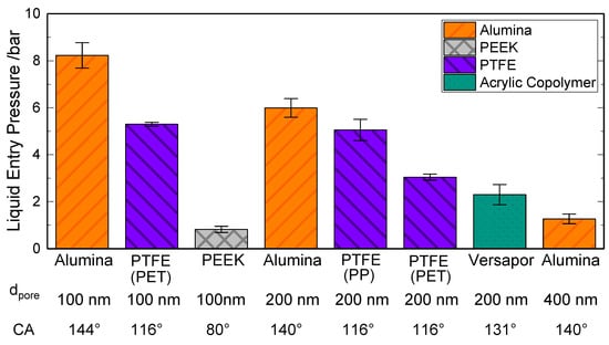 As per Figure 6, the strong dependence of the LEP with the characteristic pore size can be confirmed. In this case, the characteristic pore size is taken as the mean pore size given by the manufacturer, as the largest pore size could not be determined within the current study. It can be observed that membranes with higher characteristic pore sizes, in this case, the Alumina-400, present the lowest LEP which follows the behavior depicted by the Young–Laplace Equation (Equation (1)). It is noteworthy that porous PEEK membranes, promoted as appropriate for membrane distillation, display a contact angle of 80° and still a LEP value of 0.82 bar.