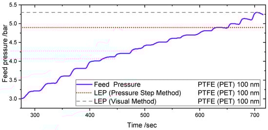 The LEP was determined as per the pressure difference detected by two pressure sensors: The pressure sensor (Model P-31, accuracy of 0.005 bar, WIKA Alexander Wiegand SE & Co. KG, Klingenberg, Germany) in the feed side (PI 01) and a second pressure sensor (Model P-30, accuracy of 0.005 bar, WIKA Alexander Wiegand SE & Co. KG, Klingenberg, Germany) in the permeate side. Therewith, the detection of LEP was possible when pressurized experiments with nitrogen on the permeate side were performed. Before each measurement, water was pumped through the system to flush out the air trapped by the assembly of the cell. The pressure was increased in 0.1 bar steps and then held for 12 s. A decrease of the gradient higher than 0.05 bar/s during the holding phases indicated the attainment of the water breakthrough pressure.