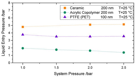 Figure 9 shows the LEP results for 3 different membranes at room temperature: the acrylic copolymeric membrane-200 nm, the alumina membrane-200 nm, and the PTFE membrane supported by PET-100 nm. Each point is the average of two consecutive measurements. As per Figure 9, no trend can be identified when system pressure is increased; the LEP looks to remain barely unaffected. This behavior can be explained by the minor effect of the pressure in the surface tension in the studied range, where the intermolecular forces between liquid molecules remain nearly unchanged [43]. Accordingly, no remarkable effect can be observed in the measured LEP. Based on [44,45], when increasing the pressure up to 2.5 bars, only a 0.3% decrease in surface tension can be expected [6,46,47,48]. The slight differences in LEP behavior for the different membranes may be due to secondary effects occurring during the measurement.